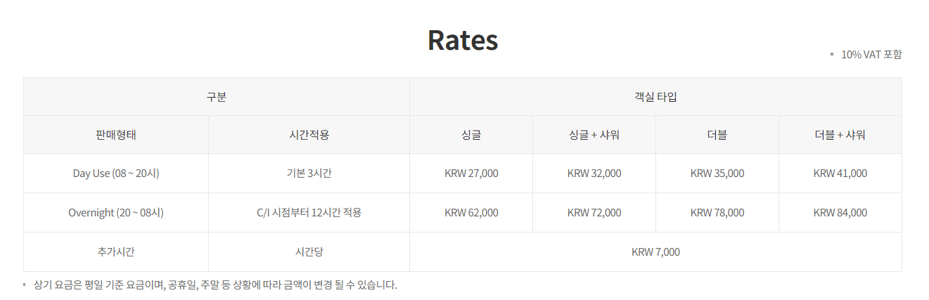 기본 3시간이고 가격은 주간은 싱글 27000원, 싱글+샤워 32000원, 더블 35000원, 더블+샤워 41000원