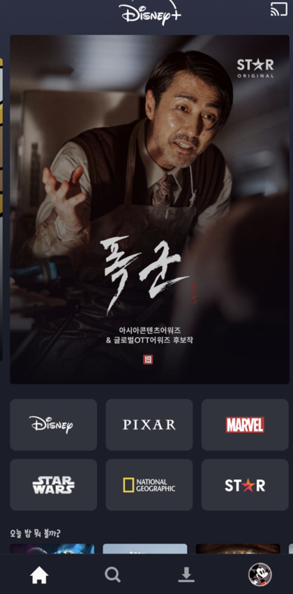 디즈니, 픽사, 마블, 스타워즈, 내셔널지오그래픽, Star를 다 함께 즐길 수 있는 곳. 인기 영화, 고전 작품, 시리즈, 오리지널을 모두 한자리에서 만나보세요.