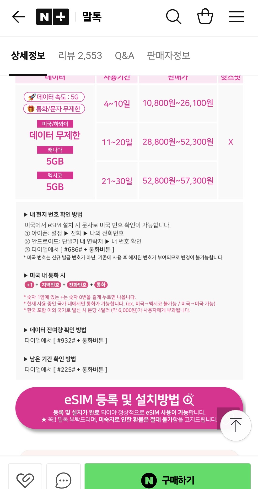 미국이심 eSIM 하와이 캐나다 멕시코 무제한 AT&T 티모바일 1일 500MB e심 : 말톡